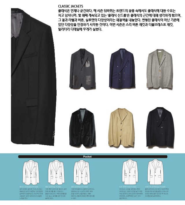 유선형으로 길게 뻗은 라펠과 은장 단추 등 곳곳의 디테일이 오리지널 미 해군의 유니폼을 연상시킨다. 밝은 감색 더블브레스트 재킷. 19만9천원.