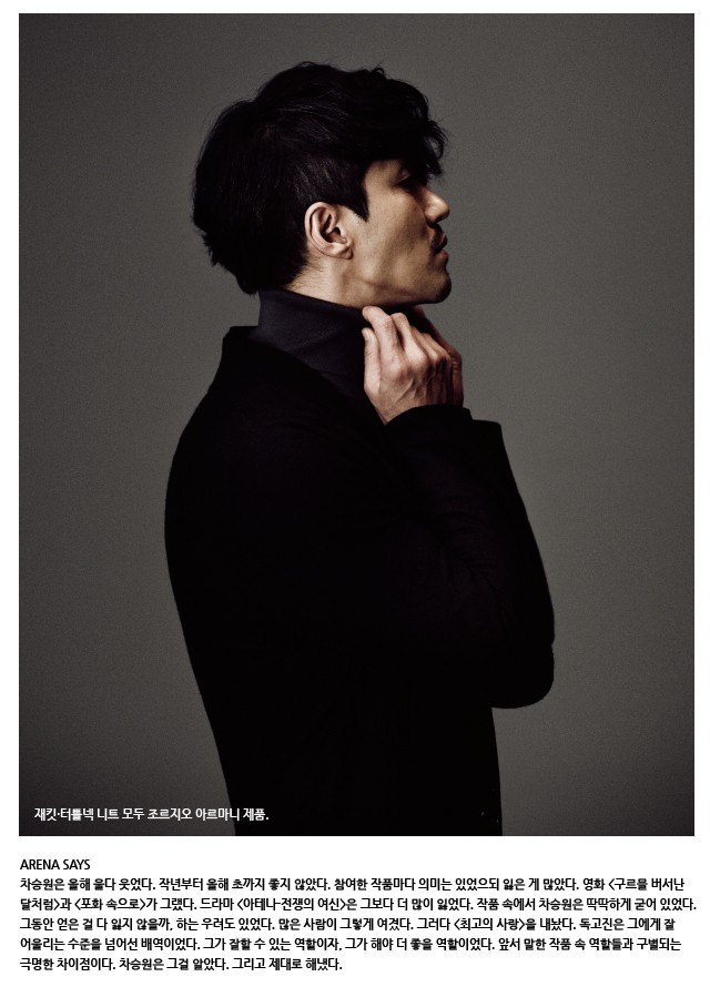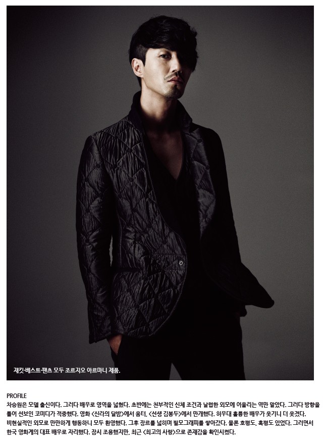 차승원은 사진 찍힐 줄 안다. 그동안 만난 이름깨나 있는 배우들 중에 발군이다. 그도 알고, 사진가도 안다. 무심하게 서서 미세하게 움직인다. 야간 침투하는 특수부대원이 하룻밤에 1m를 움직이듯이 그렇게. 그러면서 그는 카메라 렌즈로 침투한다. 그 미세한 변화 속에, 좀 과장하면 여러 감정이 뒤섞인다. 이때 차승원이 한마디 한다. 이건 좀 순수해 보이는데? 압축-폭발-배기가 일어난다. 다시 압축. 그가 서 있는 스튜디오의 흰 공간은 크다. 누구든 혼자 서 있으면 덩그러니 놓인 기분일 게다. 하지만 차승원이 다시 들어서자 채워진다. 단지 서 있을 뿐인데도. 차승원이라는 배우의 역량이다. 빈틈이라곤 찾을 길 없는 그가 입을 연다. 위기란다. <최고의 사랑>으로 시청자를 울리고 웃긴 직후인데? 마저 듣는다. 예전에도 위기였고, 지금도 위기란다. 엄격하다. 그의 턱선이 날렵할 수 있는 이유이기도 하다.