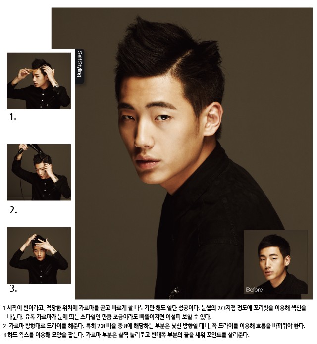 가르마 하나로 1960년대 풍의 스리피스 수트를 잘 차려입은 신사나 패션 잡지의 모델처럼 보일 수 있다. 솔직한 얘기로 이 두 가지 경우를 실현하기란 그리 쉽지 않다. 이럴 땐 정석대로 가는 게 오히려 독이 될 수 있다. 현대적인 스타일로 재해석한 2:8 가르마를 대안으로 제시한다.