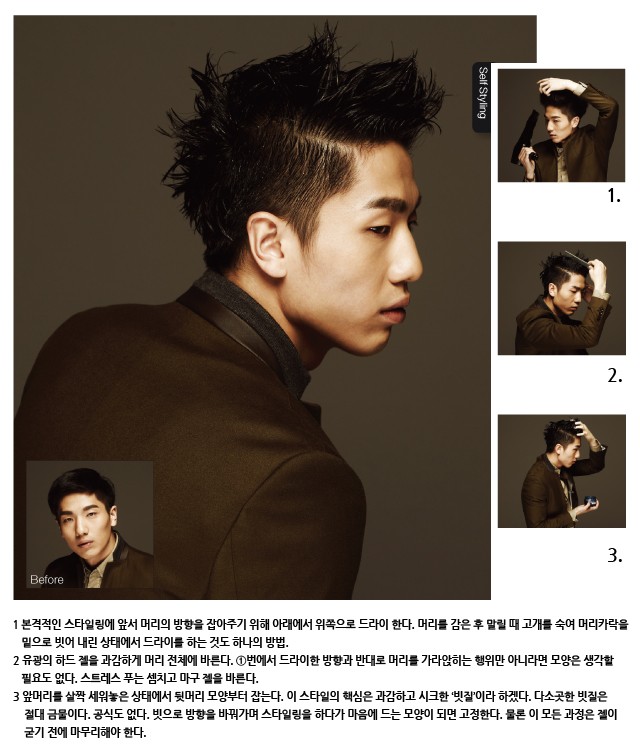 언제부턴가 남자들이 젤보다 왁스를 선호한다. 이유는 젤이 왁스에 비해 지속력이 우수함에도 반짝이는 느낌이 자연스럽지 않아서일 테다. 문제의 그 ‘반짝임’을 한껏 강조한 과감한 젤 스타일을 연출해보자. 머리도 마음도 촉촉이 젖은 듯한 느낌으로 흐트러짐 없이 밤새 즐기는 거다.