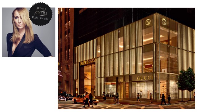 프리다는 우선 미모로 사람들의 관심을 사로잡는다. 그리고 광활한 영역의 디자인을 통해 다시 한 번 놀라움을 준다. 그녀는 구찌의 디자인을 이끄는 크리에이티브 디렉터를 넘어 매장 디자인까지도 감각적으로 처리해내는 능력을 선보이고 있다. 구찌에 합류한 지 2년 만에 액세서리 디렉터가 되었고, 톰 포드의 구찌를 프리다의 구찌로 변모시킨 능력은 매장 디자인에서도 적중하고 있다. 팔방미인인 그녀가 완성해낸 매장들은 무늬 글라스, 광택 있는 골드, 스모크 미러, 스모크 글라스와 같은 새로운 소재를 사용해 구찌만의 우아한 고급스러움을 만천하에 알리고 있다.