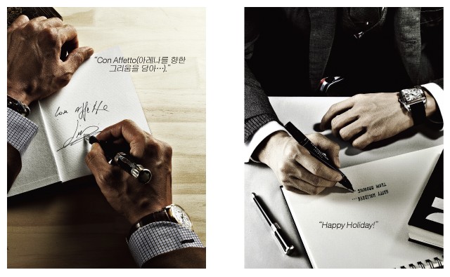 세련된 스틸 소재의 만년필 2백20만원 몽블랑, 문자반 중앙에 아주 세밀한 다이아몬드를 세팅한 검은색 가죽 스트랩 워치 가격미정 프랭크 뮬러, 남색 줄무늬 셔츠 10만원 S.T.듀퐁, 빈티지한 남색 스웨터 가격미정 캘빈클라인 진 제품.