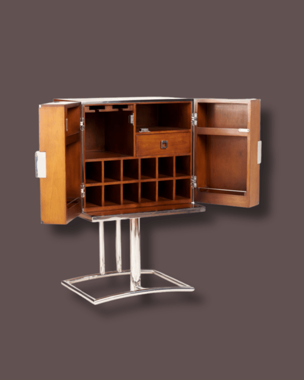 견고한 우드 프레임과 크롬 스틸 레그의 조합이 클래식하면서도 모던한 인상을 전한다. 문을 열면 위스키, 와인 등 다양한 병을 수납할 수 있는 16개의 칸과 잔을 걸 수 있는 랙과 수납 서랍이 상단에 위치한다. 문 안쪽 선반에는 스틱형 디캔터나 칵테일 툴, 향초 등을 진열할 것.