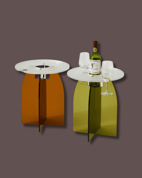 앱톤 와인 테이블의 디자인 곳곳에서는 와인을 즐기는 이를 위한 세심한 배려를 엿볼 수있다. 상판 중앙에는 와인 병을 안정감 있게 고정할수 있는 홀더가, 양옆에는 잔을 꽂을 수 있는 컷 아웃 구조가 더해져 와인을 즐기기에 최적화되었다. 간결한 원형 상판과 선명한 컬러의아크릴 디자인은 공간에 생기를 더하는 요소.