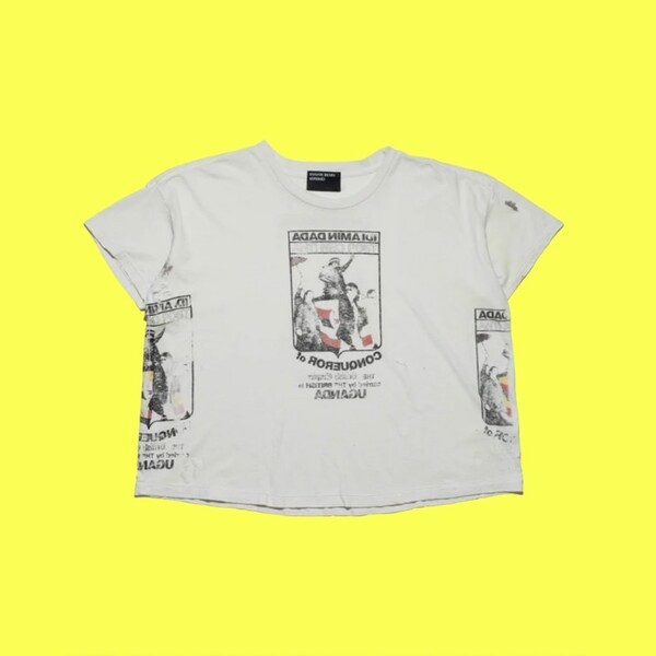 자세히 들여다보면, 군복을 입은 남성이 깃발을 든 채 연단 위에서 권위를 과시하고 있다. '아프리카의 히틀러'라 불린 이디 아민 다다(Idi Amin Dada)를 기억하는가? 이 티셔츠는 그의 이름을 패러디하고, 프린트 전체에 거울에 비친 듯한 반전 효과를 더해 독재 권력에 대한 날카로운 비판을 담았다. 더불어, 이미지 하단에는 영국 제국주의의 흔적까지 지적하며, 권력과 식민의 잔재를 동시에 겨냥하는 강한 메시지를 전달한다.