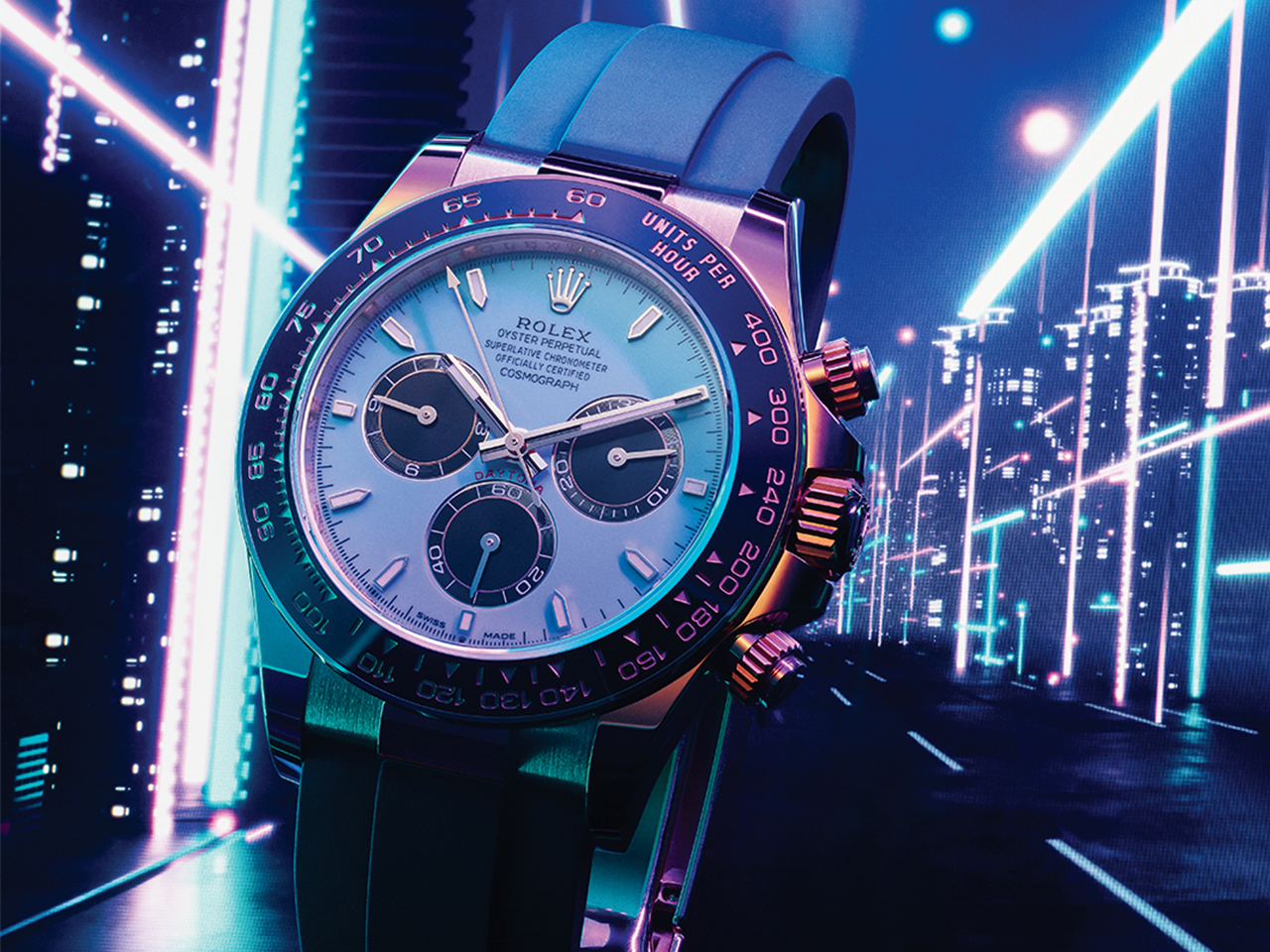 1960년대 초 데이토나 인터내셔널 스피드웨이의 공식 타임키퍼가 된 롤렉스. 1963년엔 이에 뿌리를 둔 ‘코스모그래프 데이토나’라는 이름의 크로노그래프 시계를 선보인다. 6시 방향 스몰 세컨즈 카운터 위에 훈장처럼 새긴 붉은색 ‘Daytona’ 문구, 4131 셀프와인딩 크로노그래프 칼리버, 최대 시속 400km까지 속도를 측정할 수 있는 타키미터 세라믹 베젤은 이 시계의 전통과 진화의 증거.