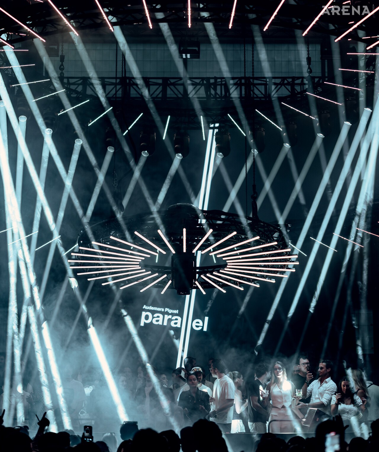 MJF 기간 중 열리는 또 하나의 빅 이벤트인 ‘오데마 피게 패럴렐’이 그 주인공. 오데마 피게는 MJF와 파트너십을 맺고 2022년부터는 MJF가 열리는 시즌에 그들과 협력해 오데마 피게만의 축제인 ‘패럴렐’을 열었다. 오데마 피게 패럴렐은 MJF 기간 중 딱 하루, 매우 비밀스럽고 예상치 못한 장소에서 그해 주제에 맞는 개성 있는 음악 경험을 선사하는 이벤트다. 올해는 오데마 피게 창립 150주년이라는 상징적인 해로 그 어느 때보다 예사롭지 않은 스케일의 이벤트가 열릴 것이라 짐작할 수 있었다. 이벤트에는 콘테스트를 통해 당첨된 이들을 포함해 브랜드 VIP, 미디어 등 전 세계에서 초청받은 1000여 명의 진정한 음악 애호가만이 참석할 수 있었다. 철저히 비밀리에 부쳐진 장소, 소문처럼 떠도는 아티스트 라인업을 두고 기대감이 고조됐다. 저녁이 되어 버스를 타고 이동하는 순간에도 도착지를 알 수 없었다. 산비탈을 타고 넘어 살짝 멀미가 올라올 때쯤 도착한 곳은 제네바호수와 산 능선이 내려다보이는 부브리(Vouvry) 지역의 옛 화력발전소. 산 정상에 ‘어떻게 이런 걸 지었을까’ 싶은 위화감이 느껴질 정도로 거대한 형태인 이곳은, 한때 산업의 심장이었지만 이제는 동력을 잃고 폐허로 남겨진 곳이었다. 냉랭한 산바람, 울먹이는 하늘까지 분위기가 스산했지만 건물 깊숙한 곳에서 들려오는 ‘쿵쾅’거리는 비트 소리에 생명력을 잃은 듯 보이는 건물이 아직 심장이 뛰고 있음에 안도감을 느꼈다. 소리를 따라 안으로 들어가보니 화력발전소는 웅장하고 근사한 공간으로 탈바꿈해 있었다. 현대 산업의 잔재는 화려하고 정교한 조명과 공간을 팽팽하게 채운 사운드 그리고 오데마 피게 패럴렐에 참여한 이들의 열기로 다시 태어난 것이다. 그리고 비로소 확인한 올해의 라인업. 파리 출신의 딥 하우스 장르 신예 알렉스 완(Alex Wann), 하우스, 디스코, 펑크 등 장르를 넘나드는 DJ 클로에 카이예(Chlo Caillet), 익숙하고 자랑스러운 한국의 대표 DJ 페기 구(Peggy Gou)까지 한곳에서 보기 힘든 EDM(Electronic Dance Music) 아티스트가 공연을 준비하고 있었다.