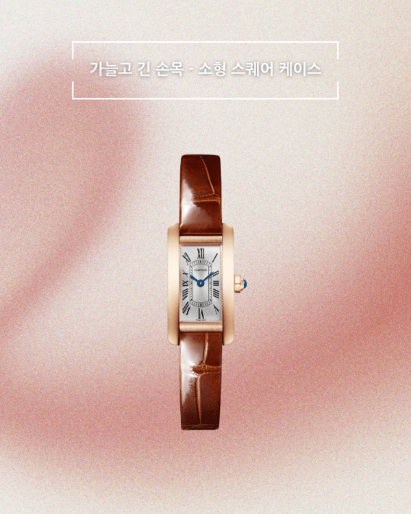 얇고 길게 뻗은 손목에는 세로 비율이 강조된 스퀘어형 케이스가 잘 어울린다. 손목선을 따라 자연스럽게 떨어지는 직선과 곡선의 대비가 손목을 더욱 슬림하고 세련돼 보이게 한다. 1917년 탄생한 오리지널 탱크 루이 까르띠에의 유려한 비율을 계승한 까르띠에 탱크 아메리칸은 그 정수를 보여준다. 손목을 감싸는 듯한 케이스 라인은 클래식하면서도 현대적인 인상을 주고, 얇은 케이스 두께와 콤팩트한 비율 덕분에 다양한 스타일링과도 잘 어울린다.