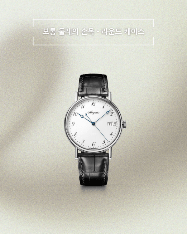 적당한, 그리고 보통의 둘레를 가진 손목은 어떤 케이스 형태든 안정적으로 소화한다. 직선과 곡선의 밸런스가 좋은 기본형 체형이기에 모든 유형의 케이스가 잘 어울리지만 그중에서도 라운드형 케이스가 가장 본연의 아름다움을 드러낸다. 브레게 클래식 5177은 브랜드의 정통성을 상징하는 모델로 둥글고 군더더기 없는 케이스 라인과 기요셰 다이얼, 오픈 팁 브레게 핸즈가 우아함을 완성한다.