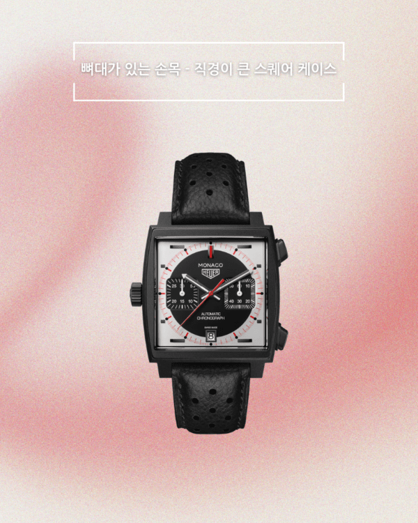 볼륨감 있고 뼈대가 드러나는 손목에는 존재감 있는 케이스를 권장한다. 직선의 힘이 강조된 대형 스퀘어 케이스는 손목 위에서 시원한 비율감을 보여주고 남성적인 에너지를 극대화한다. 그런 의미에서 태그호이어 모나코 크로노그래프만큼 완벽한 해답도 드물다. 사각형이면서 방수 기능을 갖춘 자동 크로노그래프의 선구자라는 권위를 가진 태그호이어의 모나코 컬렉션은 수직으로 떨어지는 러그와 과감한 케이스 라인이 강인한 인상을 남긴다.