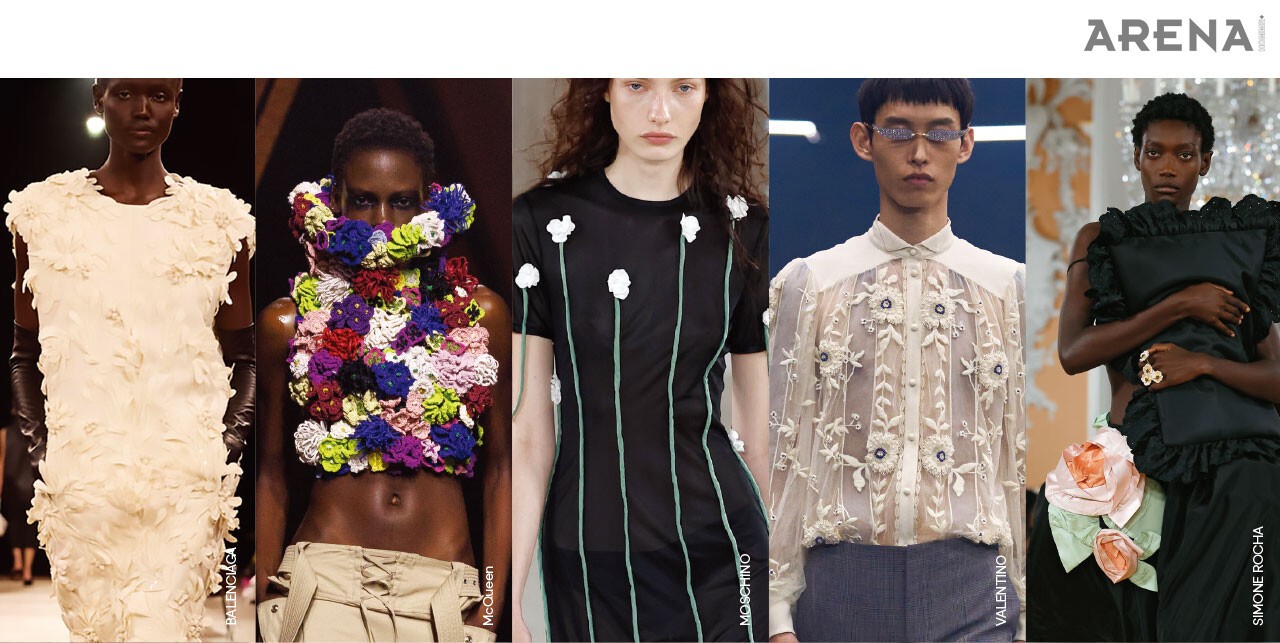 매년 봄과 여름 시즌에 만개하는 플로럴 패턴. 올해는 단순한 무늬가 아닌, 아플리케, 자수, 니트를 활용해 생화처럼 생기와 입체감이 살아 있는 꽃을 표현했다. 풍성한 꽃다발을 상의에 두른 맥퀸, 꽃과 줄기를 오브제로 표현한 모스키노를 보면 대번 이해된다.