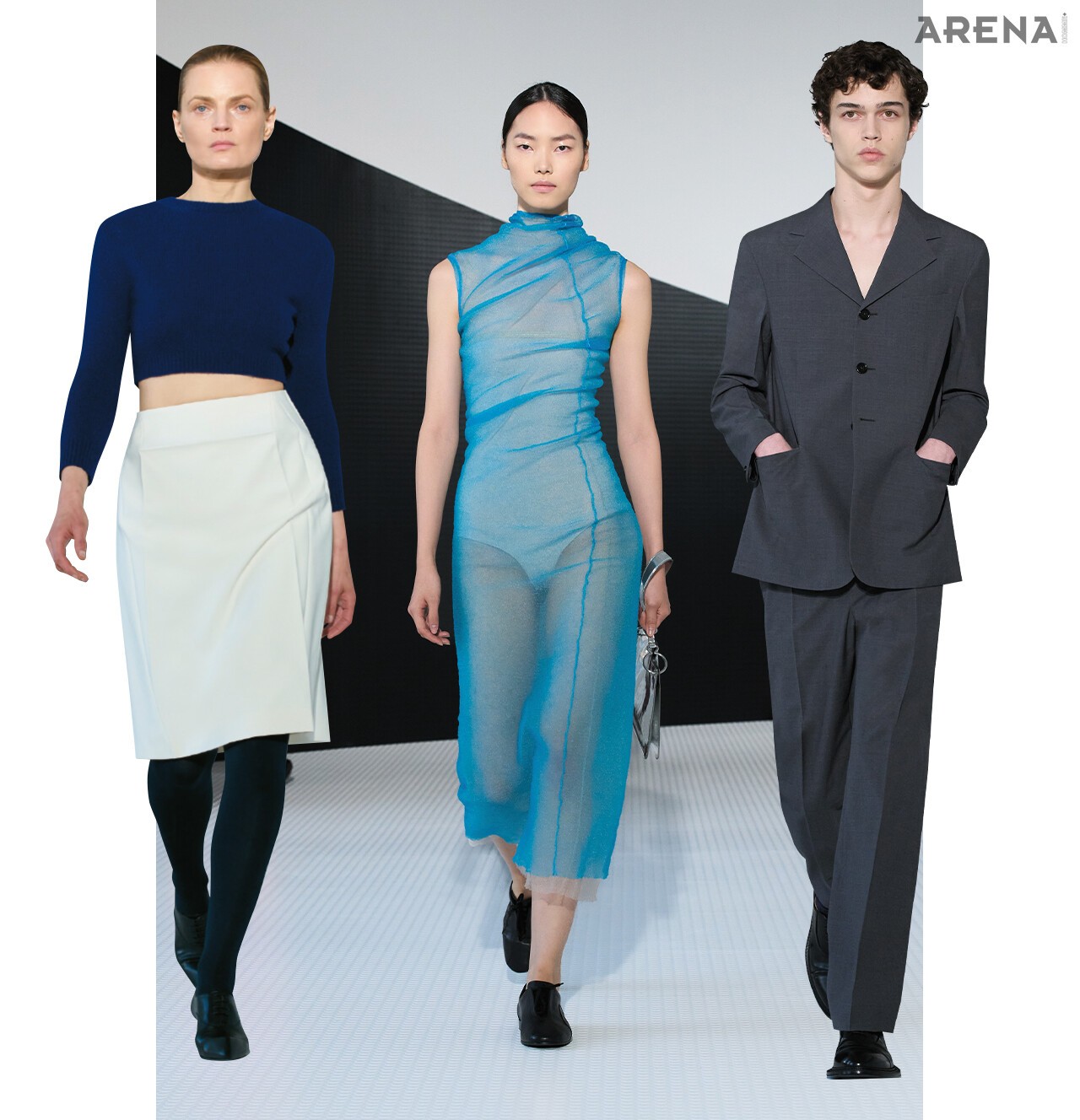 시모네 벨로티의 질 샌더 데뷔 쇼에서 반가운 얼굴을 마주했다. 바로 컬렉션의 시작을 연 모델 기네비어 반 시누스. 지금까지 꾸준히 회자되는 질 샌더 1996 S/S 캠페인의 주인공인 그는 시간이 흘렀음에도 여전히 선연한 존재감으로 런웨이를 단숨에 장악했다. 간결하고 직선적인 룩들은 언뜻 그 시절의 옷과 크게 다를 바 없어 보였다. 하지만 찬찬히 살펴보니 구겨진 주름과 거친 마감으로 의도적인 균열을 내고 슬릿이나 컷아웃, 투명한 소재를 사용해 은근하게 몸을 노출하는 방식으로 새로운 변주를 더한 것이 눈에 띄었다. 질 샌더의 아카이브를 충실하게 반영한 컬렉션이었지만, 시모네 벨로티만의 고유한 색이 얼마나 명확하게 드러났는지는 아직 미지수.