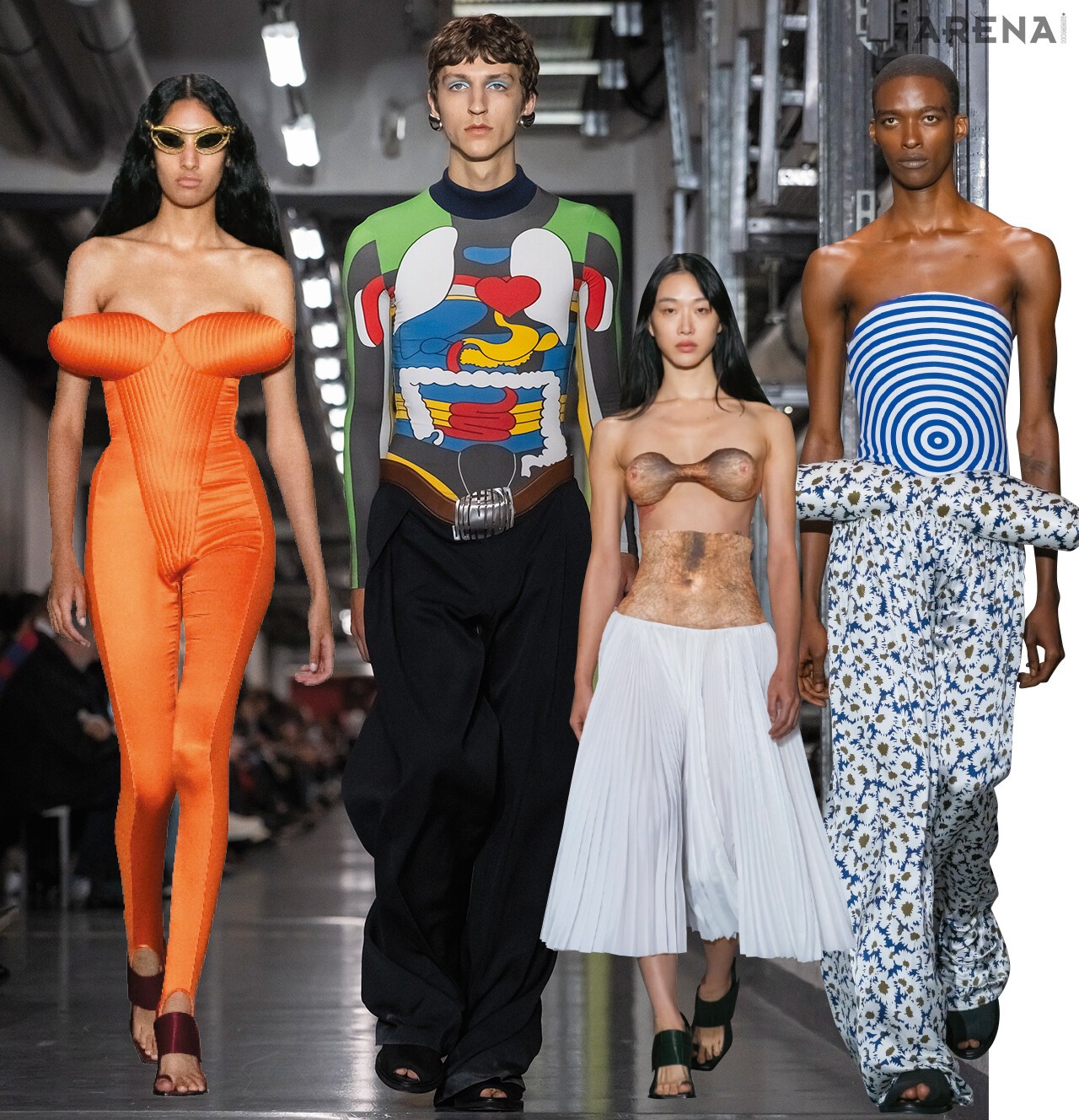 게스트 디자이너를 초청해 컬렉션을 꾸려오던 장 폴 고티에가 마침내 듀란 랜팅크를 자신의 후임 디자이너로 맞이했다. 패션계의 ‘앙팡 테리블’로 불리던 그가 동시대의 가장 재기 발랄한 디자이너에게 바통을 넘긴 것은 어쩌면 당연한 수순인지도 모른다. 파격적인 원뿔 모양 콘 브라를 만든 장 폴 고티에와 3D 프린팅으로 인체를 과장하고 왜곡하는 듀란 랜팅크는 분명 연속선상에 있기 때문이다. 첫 번째 컬렉션의 이름은 ‘주니어(Junior)’로, 컬트적인 ‘주니어 고티에’ 라인의 오마주다. 트롱프뢰유 효과와 착시를 일으키는 기하학적인 프린트는 모두 장 폴 고티에의 아카이브에서 착안했다. 하지만 듀란 랜팅크는 한발 더 나아갔다. 형태를 부풀리고 비율을 재정의하는 것은 물론, 실루엣이 적나라하게 드러나는 보디수트와 과감한 노출을 통해 장난스럽고 도발적인 컬렉션을 완성했다. 피날레에서 두 사람이 감격스럽게 포옹하는 모습을 보니 ‘주니어’라는 컬렉션 이름이 브랜드의 바통을 넘겨받은 듀란 랜팅크의 은근한 선언이자 다짐처럼 느껴졌다.