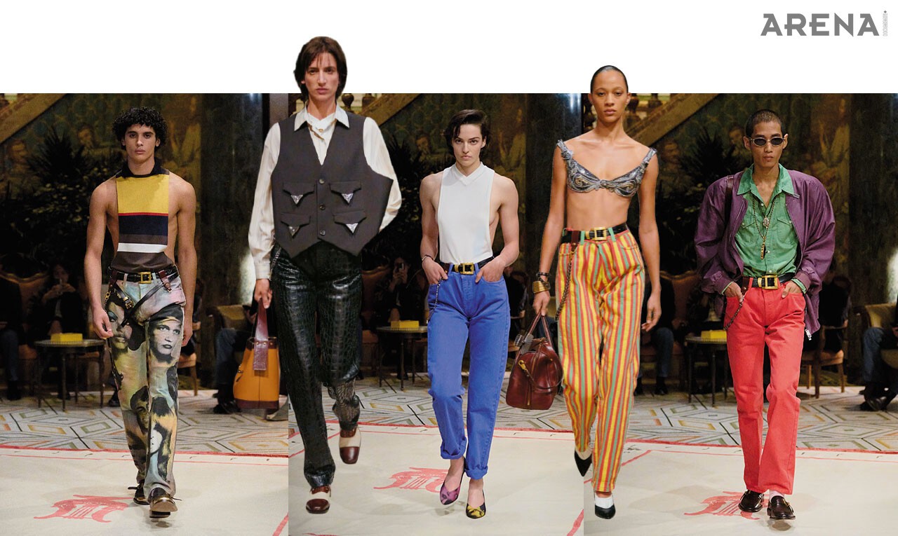 지난 시절의 패션을 가장 현대적이고 세련된 방식으로 풀어낸 이는 다리오 비탈레였다. 그는 잔니 베르사체의 아카이브와 1980년대 패션에서 추출한 컬러, 글램 스타일을 조합해 자신만의 언어로 재구성했다. 상체를 과감히 드러낸 슬리브리스와 팝아트적인 프린트, 바지의 지퍼를 반쯤 내린 채 스타일링하거나 쇼츠를 돌돌 말아 올린 연출은 베르사체의 화려하고 관능적인 세계관이 드러나는 지점. 볼드한 네크리스, 커다란 버클 벨트, 가죽 베스트와 스트라이프 데님까지. 모두 잔니 베르사체가 브랜드를 이끌던 시절의 것과 꼭 닮아 있었다. 과거의 유산을 재현하는 데 그치지 않고 베르사체의 본질을 동시대적인 감각으로 재탄생시킨 다리오 비탈레의 컬렉션은 과거와 현재 사이에서 완벽한 균형을 이룬 유의미한 쇼였다.