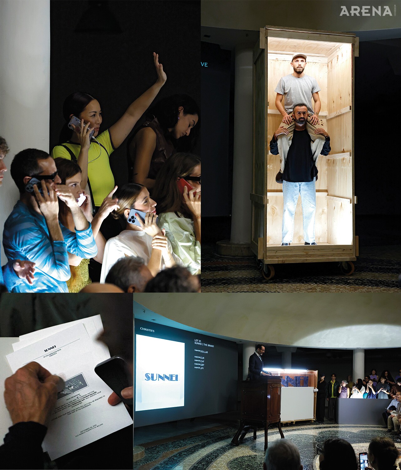 이번 시즌 가장 충격적인 쇼는 단연 써네이였다. 그들은 2026 S/S 컬렉션을 라이브 경매 방식으로 진행했다. 모두가 자리에 앉고 쇼가 시작되자, 경매 대상이 다름 아닌 써네이 그 자체임이 밝혀졌다. 거대한 나무 상자 두 개 안에는 커다란 써네이 로고 간판과 두 디자이너가 들어 있었다. 한쪽에 서 있던 모델들은 입찰자를 흉내 내며 경매를 시작했고, 낙찰이 모두 끝나자 모델들은 무대 뒤로 사라졌다. 갑작스러운 소식을 전한 두 디자이너는 오늘날 패션 산업의 메커니즘을 경매 형식으로 풍자하며 작별을 고했다. 소규모 브랜드와 젊은 디자이너들이 처한 현실과 그들에게 닥친 어려움을 시사한 써네이의 씁쓸했던 마지막 쇼.