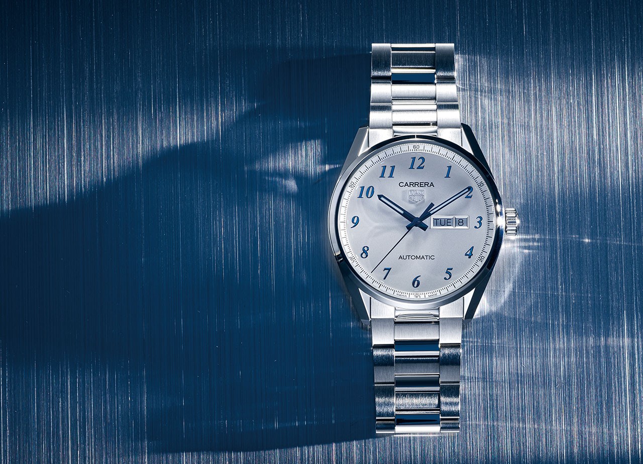 크로노그래프를 시작으로 투르비용, 세일링, 문페이즈 등 수많은 갈래로 파생해 명성을 이어온 태그호이어 까레라. 그중에서도 데이 데이트 모델은 까레라로 쌓아온 인지도, 날짜와 요일을 담은 실용적인 기능 그리고 트렌디한 올라운더 스포츠 워치 형태를 지닌 모범적인 시계다. 최근엔 흰색 다이얼에 청량한 파란색 아라비아 숫자 인덱스와 핸즈를 조합한 모델을 내세웠다. 기존 바 인덱스와는 다른 지적인 이미지를 겸비한 새로운 얼굴. 스테인리스 스틸 케이스에 지름은 41mm, 까레라 특유의 입체적인 케이스 디테일을 비롯해 알파벳 H 형태의 링크를 이어 붙인 스틸 브레이슬릿은 그대로 간직했다. 이 시계를 가만히 보고 있자니 금속이 가공될 수 있는 가장 이상적인 지향점이 아닐까 싶다.