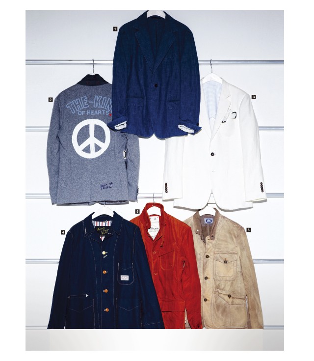 1 소매를 둘둘 말아 화이트 진 팬츠와 매치하면 리조트 룩으로 연출할 수 있는 데님 재킷 가격미정 아스페시 제품. 2 등 뒤에 그려진 페인팅이 위트 있는 면 소재 재킷 1백39만원 모스키노 워모 제품. 3 깨끗한 순백색 투 버튼 재킷 54만8천원 빈폴 맨즈 제품. 4 서로 다른 단추 모양과 라펠의 패치가 독특한 가벼운 면 소재 재킷 39만8천원 커스텀멜로우 제품. 5 어두운 주황빛 코듀로이 재킷 21만9천원 마샬 아티스트 제품. 6 도톰한 소재로 방풍 기능을 더해 워크웨어로도 손색이 없는 왁싱 재킷 가격미정 C.P. 컴퍼니 제품.