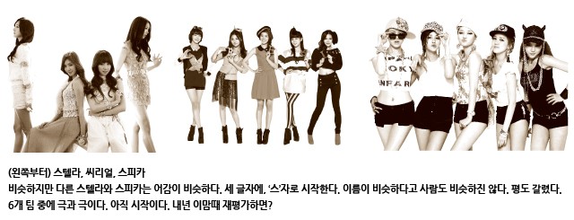 음악 음악성을 논하기 전에, 처음부터 구성이 안 좋았다. 발라드에 강점이 있는 ‘허니 듀’의 두 멤버에, <1박 2일> 시청자 투어 때 ‘국악고 얼짱’으로 각광받은 가영(김가영)과 무용 전공인 전율(전유리)을 결합시켰다. 두 명은 춤추고, 두 명은 노래한다? 퍼포먼스 뭔가 허전한 SF 콘셉트? 외모 물론 트렌드를 따라 큐트 콘셉트를 노리며 시작했는데, 처음엔 그저 ‘다들 너무 말랐다’는 느낌을 줄 뿐이었다. 가능성 스텔라의 음악은 조금은 낯설고 가끔은 전위적(?)이라는 느낌도 준다. 에프엑스도 초반엔 약간 그랬는데 멤버 구성과 퍼포먼스의 꽉 짜인 구성력으로 곧 대중에게 파고들었다. 스텔라에게도 그런 전략이 필요하다. 이 팀, 뭔가 느슨하다. 호감도 ★★