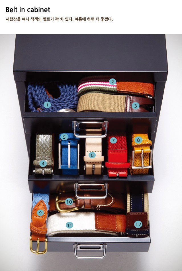 1 도톰한 두께감의 어두운 감색 패브릭 벨트 7만9천원 브룩스 브라더스 제품. 2 자줏빛 줄무늬가 캐주얼한 느낌을 더한다. 7만5천원 타미 힐피거 제품. 3 어두운 갈색 면 소재와 부드러운 질감의 가죽이 어우러져 고급스럽다. 가격미정 토즈 제품. 4 오묘한 색의 섹시한 파이톤 소재 벨트 37만원 폴 스미스 제품. 5 올여름 이 벨트 하나면 충분하다. 시원해 보이는 파란색 스웨이드 벨트 63만원 브리오니 제품. 6 심심해 보일까 걱정하지 않아도 된다. 어떤 옷에나 무난하게 잘 어울릴 테니까. 28만원 보스 블랙 맨 제품. 7 여자의 빨간 립스틱에 퐁당 빠진 것 같다. 23만원 아랄디 1930 by 란스미어 제품. 8 폭과 길이가 적당한 겨자색 가죽 꼬임 벨트 34만9천원 오르치아니 by 존 화이트 제품. 9 우유를 섞은 듯한 하늘색 꼬임 벨트 13만5천원 키엘 제임스 패트릭 by 바버샵 제품. 10 청바지나 반바지 어디에나 유용하다. 갈색 통가죽 벨트 14만8천원 랄프 로렌 블루 라벨 제품. 11 깨끗한 흰색 패브릭에 가죽을 덧대 멋스러운 벨트 2만9천9백원 유니클로 제품. 12 갈색과 감색이 섞이니 클래식한 느낌이 배가된다. 21만5천원 브룩스 브라더스 제품.
