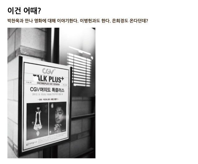 그런데 CGV여의도에서 ‘톡 플러스’란 걸 한다. 유명한 사람과 평범한 사람을 초대해 대화의 시간을 갖는다. 9월에 홍명보 감독이 왔고, 박찬욱 감독, 영화배우 이병헌도 왔다. 그리고 많은 평범한 사람들이 와서 유명한 사람과 이야기를 나눴다. 정치인 나부랭이들이 소통을 부르짖지 않아도 소통은 시대의 화두다. 우린 옛날보다 말이 많아졌고, 누군가 우리의 이야기를 들어주길 바란다. 물론 그건 외로워졌다는 증거지만, 10월 5일엔 팝 칼럼니스트 김태훈, 12일엔 소설가 은희경, 19일엔 영화감독 변영주가 온다. 대형 영화관이 그들이 가진 자본의 힘으로 어떤 좋은 일을 할 수 있을지 계속 고민하면 좋겠다. 걸핏하면 큰 놈만 붙들고 늘어지는 ‘왼쪽’ 사람들도 잘한 일엔 박수 쳐줄 거라고… 생각하는데, 아닌가? editor 이우성