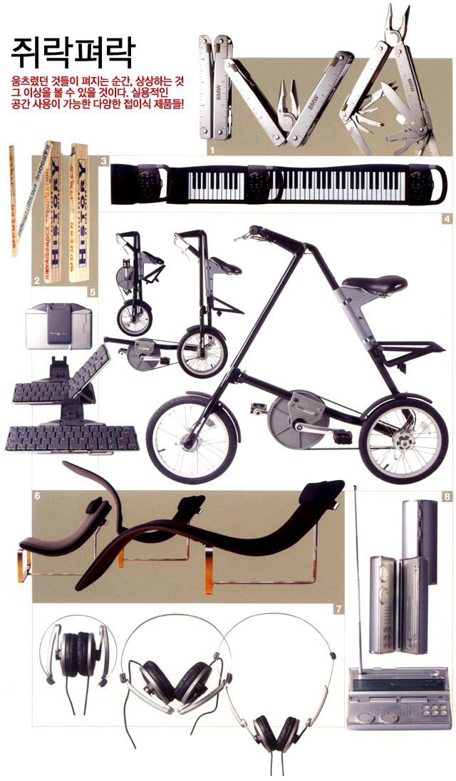 1 공구 공구와 콘돔의 공통점은 매번 새로 사놓은 것 같은데 찾을 때는 여전히 없다는 것. 이제 쓸모없는 공구 상자는 치우자. 이 12cm가량의 섹시한 스틸자 속에는 벤치부터 가위, 드라이버에 이르기까지 없는 게 없다. 어딜 가든 맥가이버가 될 수 있게끔 가방 한곳에 넣어두길. 8만9천원 BMW 라이프 스타일 제품. 2 자 어디까지 늘어날지 궁금하기만 하다. 세컨드 호텔의 접이식 자는 끊임없이 펼쳐진다. 끝까지 펼치면 성인 남성 키만큼 늘어나니 신체 검사용으로도 쓸 수 있을 정도. 총 길이 2m로 10번 접으면 24cm(옆으로 살짝 나오는 쇠 장식 포함)로 줄어든다. 11만원 세컨트 호텔 제품. 3 피아노 아무리 모든 것을 둘둘 만다고 해도 피아노까지 이럴 수 있을까. iPiano는 컴퓨터 또는 책상에 올려놓고 사용할 수 있는 크기에 두루마리 화장지처럼 말아 휴대하기도 쉽다. 4옥타브 49건반이 ‘up’과 ‘down’ 버튼을 이용하면 88건반 이상의 음역까지 확대된다. 이제 이사할 때마다 옮기기 불편한 피아노는 잊으시길. 15만8천원 inbenet.com. 4 자전거 스트라이다의 세상에서 가장 아름다운 자전거는 접었을 때 100×40cm에 9.8kg이라는 완벽한 사이즈를 자랑한다. 이것만 지닌다면 주차 공간이 부족한 도시에서 완전하게 자유로워질 수 있다. 정장을 입고 타도 될 만큼 기름때 묻을 걱정 없는 Kevlar 체인 자전거 가격은 45만7천원 스트라이다 제품. 5 키보드 싱크 아웃사이드 스토아웨이 블루투스 키보드는 PDA용으로 접었을 때 139×99 ×13mm다. 3mm의 키스트로크 블루투스를 이용한 무선 연결로 최대 10m까지 지원한다. 이제 당신이 급하게 서류를 작성할 때 PDA와 노트북 키보드를 능가하는 폴딩 키보드 둘만 쥐고 있으면 끝! 5만9천원 싱크 아웃사이드 제품. 6 소파 손님이 올 때는 거실의 장식품으로, 혼자 있을 때는 편안한 침대식 의자로 그만이다. BALERI ITALIA사의 FlIPT는 그 모양만큼이나 유니크한 변형이 가능하다. 게다가 접으면 바뀌는 색상의 조화까지! 2백70만원. 7 헤드폰 확실한 음질을 자랑하지만 헤드폰의 크기가 이어폰에 비해 망설여졌던 게 사실이다. 그러나 소니의 접이식 헤드폰 MDR-710LP는 3단으로 꺾여지는 다리가 개구리 움츠리듯 작게 변신한다. 30mm 드라이버 유닛에 자유로운 사이즈 조절이 가능한 와이드 더블 헤어밴드를 장착한 소니 신병기의 가격은 4만9천7백원 소니 제품. 8 라디오 라디오가 갖춰야 할 게 기막힌 음질과 휴대성이라면 디자인주의 라디오는 가히 최고라 할 수 있다. 누구도 상상할 수 없는 원기둥의 라디오는 펴자마자 LCD창에, 길쭉한 안테나 선까지 뽑으면 이제 당신만의 주크박스가 완성된다. 2만1천원 디자인주 제품. |