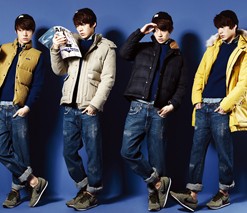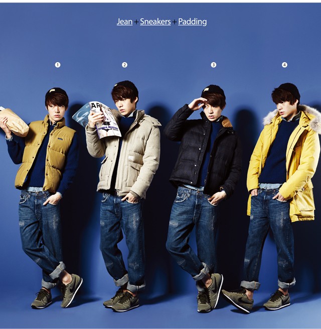 도톰한 짜임 덕에 따뜻한 파란색 니트 34만3천원 GRP by 샌프란시스코 마켓, 부들부들한 소재의 데님 셔츠 12만8천원 리바이스, 밑단을 둘둘 접어 올린 청바지 가격미정 리바이스 빈티지 클로딩, 카키색 운동화 9만9천원 나이키 스포츠웨어, 검은색 니트 비니 10만7천원 스포츠웨어 렉 by 샌프란시스코 마켓 제품.