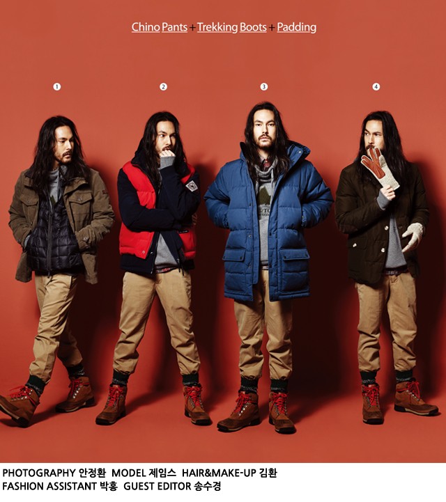 여러 가지 색이 섞인 울 소재 셔츠 13만8천원 폴로 랄프 로렌, 도톰한 회색 후드 티셔츠 11만9천원 버튼, 갈색 치노 팬츠 11만9천원 바나나 리퍼블릭, 길이가 긴 양말 에디터 소장품, 갈색 트레킹 부츠 19만8천원 컬럼비아 스포츠웨어 제품.