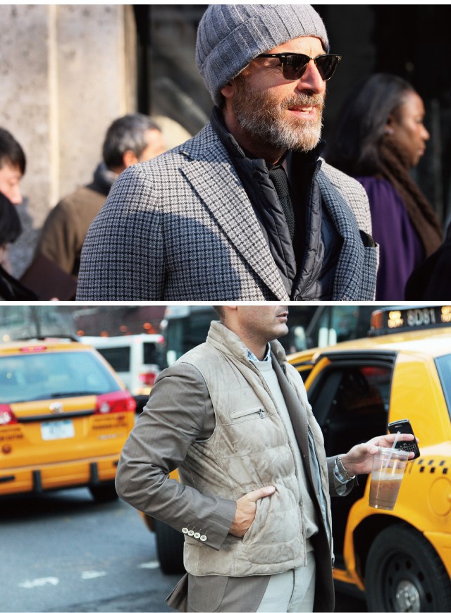 울 소재가 가장 좋지만, 레이어드의 묘미를 살리는 데에는 스포티한 소재도 괜찮다. 이때 패딩 베스트와 재킷의 색감을 통일하면 훨씬 단정해 보인다.