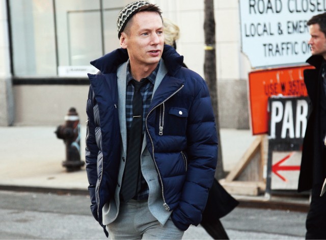 오직 기능성만을 위해 패딩 재킷을 입는 경우를 제외하면, 패딩 재킷의 문제는 언제나 ‘대충’ 입은 듯 보인다는 거다. 대안으로 테일러드 재킷 모양을 한 패딩 재킷이나, 울 소재로 된 패딩 코트 등 진화된 것들을 구입할 수 있겠지만, 그것 역시 만만찮은 비용이 든다. 두루두루 입어야 하는 아이템의 성격상 초점을 맞춰야 하는 건 그 안에 어떤 걸 입느냐다. 가장 쉬운 방법은 수트를 입는 것이다. 하지만 너무 진중하고 고리타분한 수트 차림은 당신을 10년은 더 늙어 보이게 한다. 수트의 핏은 날씬해야 하고 셔츠와 타이의 조합은 경쾌해야 한다. 그리고 가장 중요한 건 패딩 재킷이 수트 재킷의 길이보다 짧아 깡총한 느낌이 들어야 한다는 점이다.