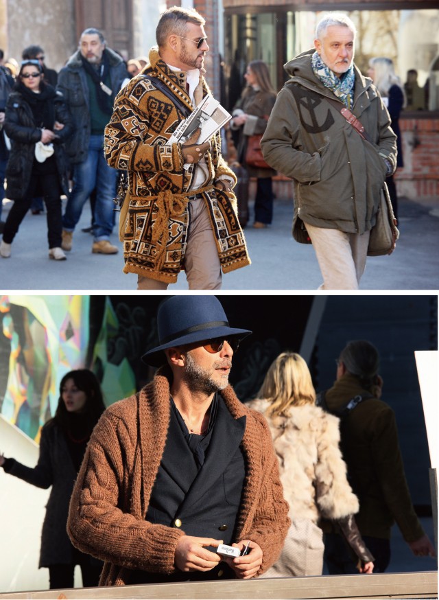 장식까지 더하면 더 좋고, 올이 굵고 두터운 것이라면 코트 못지않은 보온력이 보장된다. 게다가 니트가 주는 온화한 분위기는 시각적으로도 만족스럽다. 가장 좋은 스타일링의 예는 아래 사진 속 남자처럼 더블브레스트 재킷과 함께 입는 것이다. 다소 느슨한 니트 아우터와 긴장감 있는 더블브레스트 재킷의 조화는 스타일링에 강약을 준다. 노르딕 패턴의 니트 아우터라면 코듀로이 재킷을 선택하는 것도 좋은 방법이고, 코트 위에 덧입는 색다른 시도도 해봄직하다.