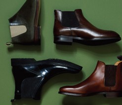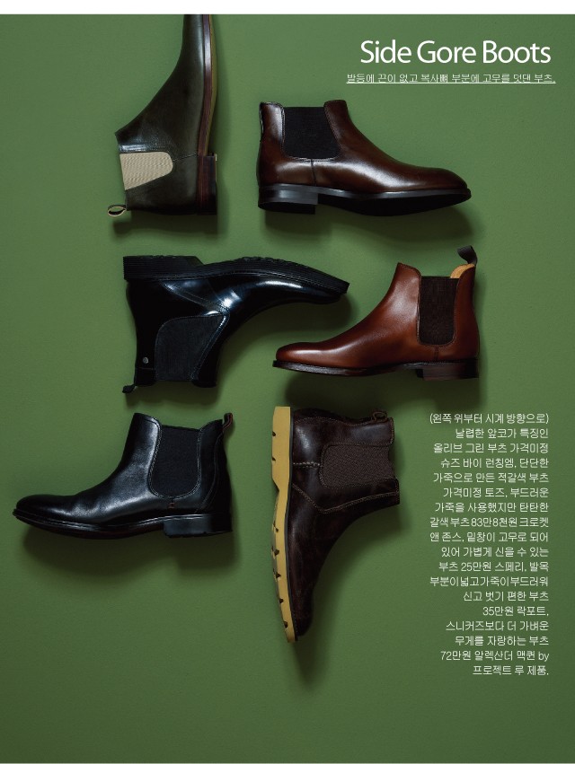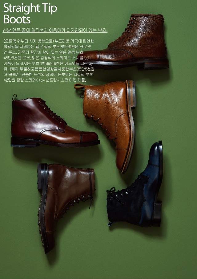 (왼쪽 위부터 시계 방향으로) 날렵한 앞코가 특징인 올리브 그린 부츠 가격미정 슈즈 바이 런칭엠, 단단한 가죽으로 만든 적갈색 부츠 가격미정 토즈, 부드러운 가죽을 사용했지만 탄탄한 갈색 부츠 83만8천원 크로켓 앤 존스, 밑창이 고무로 되어 있어 가볍게 신을 수 있는 부츠 25만원 스페리, 발목 부분이 넓고 가죽이 부드러워 신고 벗기 편한 부츠