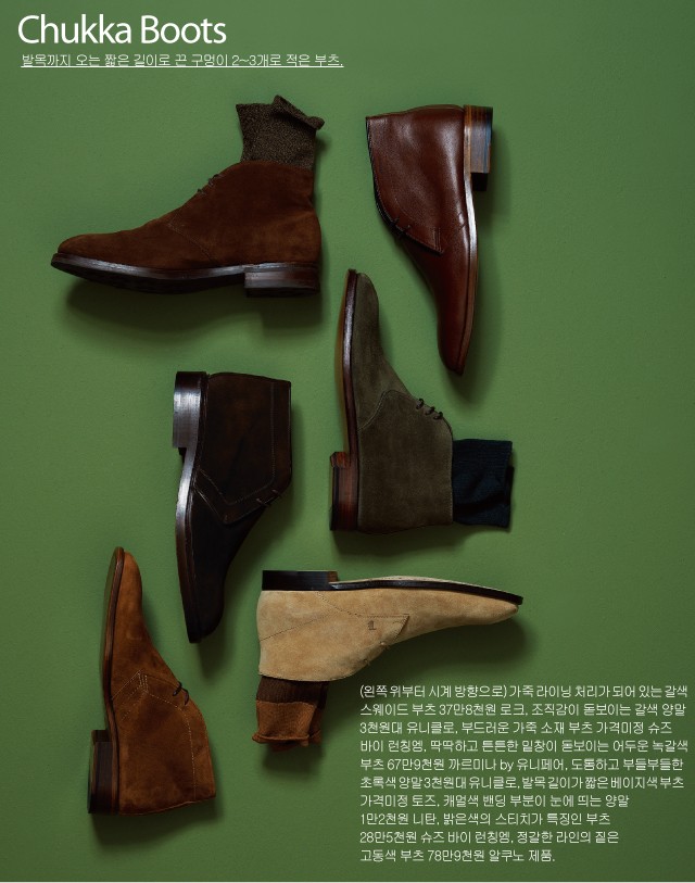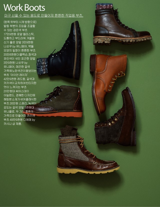 20만원대 써어스데이 아일랜드, 경쾌한 디자인에 헤링본 소재가 섞여 클래식한 부츠 26만원 스페리, 녹색이 감도는 갈색 양말 3천원대 유니클로, 두 가지 종류의 가죽으로 만들어진 카키색 부츠 49만9천원 디에메 by 카시나 샵 제품.
