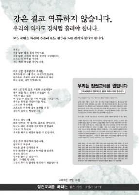 그런데도 선관위는 이 단어를 문제 삼았다. 12월 19일, 박근혜 후보는 대통령으로 당선됐다. 그리고 선거가 끝난 후 며칠이 지나지 않아, 한 작가가 고발된 것이다. 나머지 1백36명에게도 같은 조치가 행해질 것이라고 한다. 골방에 있던 작가가 광장까지 나오기에는 숱한 고민과 큰 결단이 필요하다. 그러나 일단 나오면 그들은 드세고 끈질기다. 황석영, 박범신, 신경숙, 한강 등 선배 작가가 선관위 고발에 반대하는 기고문을 발표하고 있다. 전국 곳곳의 작가 단체가 항의 성명을 쏟아내고 있다. 일부 젊은 문인은 벌금형이 나오면 그냥 몸으로 때우겠다고 ‘노역’을 공언했다(난 아니다). 필자는 1백37명 중 하나다. 아내와 곧 태어날 아이가 있다. 전세금 대출 이자와 각종 공과금에 시달린다. 그러니 입 닥치고 얌전히 살아야지. 라고 생각하지 않는다. 하필 문학을 하기 때문이다. 우리가 글을 쓰기 때문이다. 표현을 금하라는 선관위의 고발은 문학을 금하라는 권력의 고문처럼 들린다. 문학은 금지하는 모든 것을 금지한다. 당신의 고발을, 문학의 입으로 금지하는 바다.
