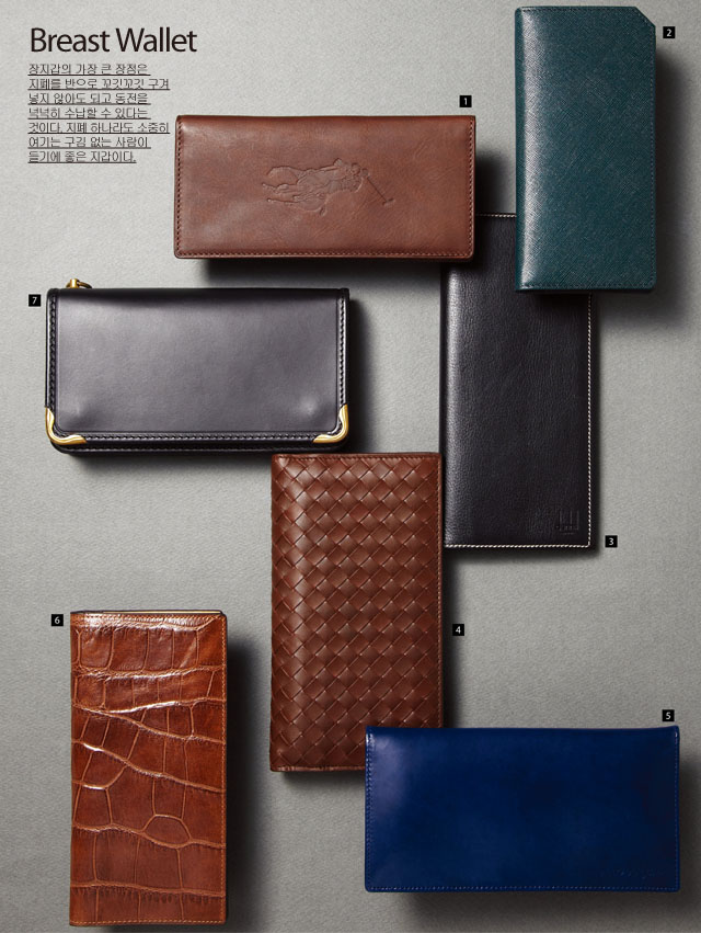1 브랜드 고유의 로고가 크게 박혀 있는 갈색 지갑 15만8천원 폴로 랄프 로렌 제품. 2 사선으로 커팅된 한쪽 모서리가 독특한 짙은 초록색 지갑 8만9천8백원 매니퀸 제품. 3 테두리에 스티치 장식이 되어 있으며 두껍지 않아 주머니에 넣고 다니기 좋은 지갑 가격미정 던힐 제품. 4 정중한 느낌이 돋보이는 지갑 94만5천원 보테가 베네타 제품. 5 광택감이 돋보이는 파란색 지갑 14만5천원 몽삭 제품. 6 가죽 특유의 질감이 돋보이는 낙엽색 지갑 가격미정 보르보네제 제품. 7 수납공간이 많아 실용적이며, 끝 부분에 체인용 고리가 있어 취향에 맞게 사용 가능한 지갑 55만8천원 웨이스트 트와이스 by 티피 제품.