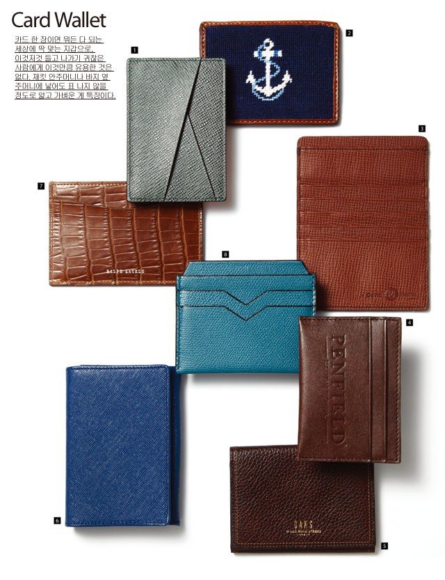 4만9천원 펜필드 제품. 5 반지갑 형태의 카드 지갑 12만8천원 닥스 액세서리 제품. 6 수납공간이 넉넉하여 약간의 지폐와 명함을 함께 수납할 수 있는 카드 지갑 3만9천8백원 매니퀸 제품. 7 악어가죽으로 만들어져 고급스러운 지갑 89만9천원 랄프 로렌 제품. 8 앞면과 뒷면 모두 모양이 같은 바다색 지갑 가격미정 발렉스트라 제품.