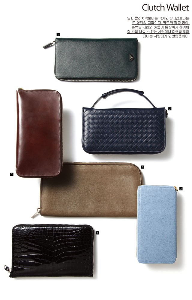 1백19만원 보테가 베네타 제품. 3 스크래치에 강한 송아지 가죽을 사용한 하늘색 지갑 13만9천8백원 매니퀸 제품. 4 악어가죽 특유의 질감이 잘 살아 있으며 수납공간이 많아 실용적인 지갑 3백30만원 콴펜 제품. 5 오래 사용할수록 멋이 느껴지는 부드러운 가죽 소재 지갑 62만9원천 유니페어 제품. 6 크기가 크고 수납공간이 넓어 이것저것 보관하기에 적당한 지갑 가격미정 발렉스트라 제품.