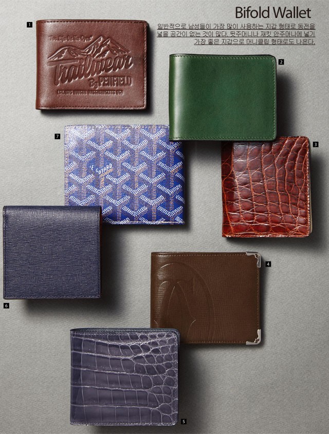 1 얇지만 수납공간이 많아 실용적인 반지갑 6만9천원 펜필드 제품. 2 가운데 지폐를 꽂을 수 있는 클립이 있어 사용하기 편리한 녹색 반지갑 9만9천원 데이빗 앤 헤넬 제품. 3 얇고 가벼운 악어가죽을 사용한 반지갑 66만9천원 유니페어 제품. 4 모서리 부분이 닳지 않게 금속 장식을 덧댄 반지갑 가격미정 까르띠에 제품. 5 회색이 감도는 옅은 하늘색 반지갑 88만원 콴펜. 6 겉은 짙은 감색이지만 내부는 청명한 주황색인 반지갑 7만4천원 루치카 제품. 7 이니셜이나 무늬를 새길 수 있는 반지갑 가격미정 고야드 제품.