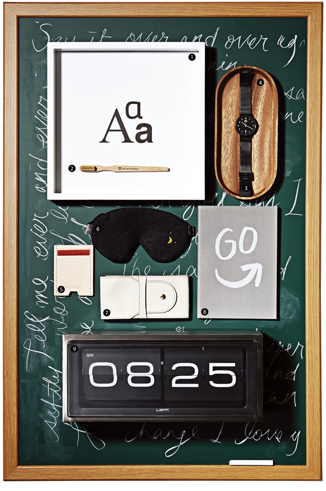 1 aaA_Basic Frame 순백색의 프레임. 끼워져 있는 브랜드 로고의 속지만으로도 충분히 소품 역할을 한다. 2만9천원 29CM 제품. 2 Redecker Wooden Toothbrush 천연 비치우드와 돼지 털 소재의 내추럴 칫솔. 1만1천원 TWL 제품. 3 Braun Men’s Watch 블랙 스틸의 메시 소재 손목시계. 32만3천원 브라운 by 현대카드 프리비아 제품. 4 Chabatree Oval Tray 담백한 형태의 아카시아나무 트레이. 2만9천원 TWL 제품. 5 R Card Wallet 불필요한 요소를 제거한 심플한 디자인의 카드 지갑. 2만4천원 로우로우 제품. 6 Cashmere embroidery(moon) 회색 캐시미어 소재에 달 자수로 포인트를 준 수면 안대. 3만2천원 노리디자인 제품. 7 Pen case 2 단순하지만 럭셔리하고 편리하기까지 한 만년필 케이스. 14만8천원 골든프로그 제품. 8 YOU GREAT. Big Blank Ver. 1-01 기본적인 기능에 충실한 무선 노트. 9천원 유그레이트 제품. 9 LEFF Brick 네모반듯하고 정직한 디자인의 레프 탁상시계. 43만5천원 라꼴렉뜨 by 현대카드 프리비아 제품