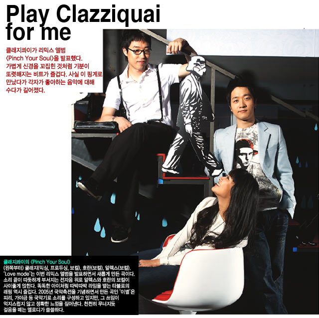 얼마 전 <Pinch Your Soul>이라는 리믹스 앨범을 발표했다. 그런데 나는 리믹스 앨범이라는 것에 대해 항상 한 가지가 궁금하더라. 이미 시행착오를 거쳐 최선이라고 결론을 내린 버전이 정규 앨범에 실리는 것 아닌가? 그런데 새롭게 리믹스 작업을 하고 앨범을 발표하는 건 어떤 이유에서일까? 클래지 1집 때도 <Zbam>이라는 리믹스 앨범을 발표했는데, 사실 (음반사)사장님의 제의가 있었다. 이번에 다시 리믹스 작업을 하는 건 생각지도 못한 부분이다. 그러던 것을 역시 주위 의견 때문에 시작하게 됐다. 2집에는 어쿠스틱한 소리들이 많이 들어간 바 있다. 악기 편성이나 이런 부분에서 다시 프로그래밍을 하기에 어려운 면이 있었기 때문에 고민을 많이 해야 했다. 전자음이 입혀진 사운드지만 이번 작업에는 묘하게 차분한 느낌이 있다. 클래지 그렇다. 요즘 내가 그쪽으로 마음이 가고 있는 건지도 모르겠지만. 뭐, 그냥 느낌이 가는 대로 작업하는 거다. 이번 리믹스 앨범 중 특히 각자 마음에 드는 트랙이 있나? 오리지널 버전보다 오히려 새로운 느낌을 받았다거나. 알렉스 내 경우에는 ‘Fill this night’다. 사실 며칠 전에 처음으로 이어폰을 꽂고 들어보았다. 평소에 그냥 흘려들을 때와는 또 다르게 너무 좋더라. 호란 ‘Cry out loud’가 좋았다. 일단은 박자가 2배로 늘어났는데, 그러면서도 몽환적인 느낌이 강해졌다. 들을 때도, 또 부를 때도 더 재미있어진 것 같다. 클래지 ‘Love mode’는 리믹스가 아니라 새로 만든 곡이기는 하지만, 상당히 재미있게 작업했다. 처음 작업한 트랙은 ‘Fill this night’, ‘Come alive’ 같은 트랙이었다. 그런데 생각보다 대중적인 방향으로 풀리지는 않은 것 같더라. 오히려 ‘Color your soul’ 같은 경우는 쉬운 코드 안에서 편하게 만들었는데 만족스러웠다. 원래 버전과 다른 맛도 있고. 에픽 하이의 타블로가 ‘Love mode’에 게스트로 참여하고 있다. ‘I’ll give you everything’에서는 제이와 바비 킴이 목소리를 빌려주고 있고. 클래지 친분이 있었기에 가능했다. 여러 랩퍼들이 있지만 꼭 타블로와 작업을 하고 싶었다. ‘I’ll give you everything’은 2집에서 알렉스와 크리스티나가 함께 부른 곡인데, 남매의 우애에 대한 내용이다. 제이와 바비 킴은 라디오 방송을 통해 알게 된 사이다. 두 분 아버님께서 예전부터 친구 사이였기 때문에 거의 남매처럼 가깝다고 하더라. 그래서인지 결과적으로 참 마음에 드는 연주가 됐다. 나 역시 두 곡이 귀에 잘 감기더군. 요즘 내내 듣고 다니는 중이다. 아, 평소에 음악은 꾸준히 듣는 편인가? 오히려 점점 다른 사람의 음악을 듣지 않게 된다는 뮤지션들도 있던데. 알렉스 내 경우에는 그래도 집이나 차 안에 있는 시간에는 항상 뭔가를 듣는 편이다. 스티비 원더를 좋아하고 디안젤로의 <Voodoo> 같은 음반도 즐겨 듣는다. 요즘에는 어릴 때 아무 생각 없이 듣던 옛날 음악에 다시 손이 가기도 한다. 건스 앤 로지스나 에어로스미스 같은 것들. 에어로스미스의 <Crazy>는 중학교 2학년 즈음 캐나다에 이민을 가서 처음 산 음반이었다. 당시 굉장히 좋아했던 기억이 있다. 클래지 나는 취향이 잡식성인데, 요즘 세르지오 멘데스의 <Timeless> 앨범을 듣고 있다. 윌 아이 엠이 공동 프로듀싱을 하고 있기 때문에 블랙 아이드 피스의 느낌이 좀 강하지 않나 싶기도 하지만, 믹싱과 소리를 잘 연구한 음악 같다. 호란 오히려 그루비한 음악보다는 어쿠스틱한 여성 보컬을 좋아하는 편이다. 최근에는 일본 여가수 시이나 링고의 리메이크 음반을 듣는다. 기본은 모던록인데 좀 전위적인 면이 있다. 자신의 색이 독특하고 뚜렷한 뮤지션이다. 현재 ‘Pinch Your Soul’이라는 타이틀로 공연을 진행 중이기도 하다. 콘서트 중 다른 뮤지션의 음악을 연주하기도 하는가? 그렇다면 이번 공연의 레퍼토리는 무엇인가? 호란 커버곡을 한다. 보통 노래를 부르는 나나 알렉스가 하고 싶은 곡을 연주하게 된다. 이번에 나는 베스 히쉬의 ‘Come a day’를 부른다. 에어의 앨범에 피처링으로 참여하기도 했던 여가수다. 알렉스 나는 제이미 컬럼의 ‘Mindtrick’이다. 원래 에릭 베네의 ‘Hurricane’을 부르려고 했는데, 예전에 존 레전드나 씰 등 비슷한 느낌의 곡을 많이 연주한 것 같아서 이번에는 약간 느낌을 바꿔보려고 음악을 찾았다. 그중 딱 귀에 들어온 곡이다. (세션을 맡은)형들도 공연 중 너무 신나게 연주를 잘해줬다. 둘이 하는 노래도 있다. 지금까지는 ‘Something stupid’ 같이 달콤한 곡을 많이 불렀다. 그런데 이번에는 프란츠 퍼디난트의 ‘Do you want to’를 한다. 녹음실 실장님이 추천해주셨는데, 재미있겠다는 생각을 했다. 콘서트장에서 연주하면 분위기가 굉장할 것 같다! 완전히 파티 느낌 아니던가? 클래지 하하, 맞다. 사실 살짝 로망도 있다. 음악하는 사람으로서 록음악을 해보고 싶은 그런 것. 그래서 더 재미있는 것 같기도 하고. 다른 뮤지션의 공연을 보러 가는 경우도 종종 있나? 아무래도 시간을 내기가 쉽지는 않을 것 같은데. 알렉스 캐나다에 있을 때는 많이 놀러다녔다. 오히려 그때는 음악을 하는 사람이 아니었으니까 퇴근하면 공연도 보러 다니고 그랬다. 요즘은 어렵다. 제임스 