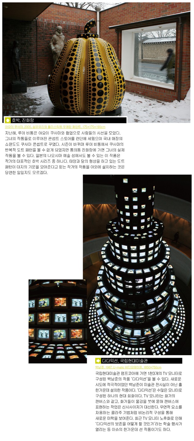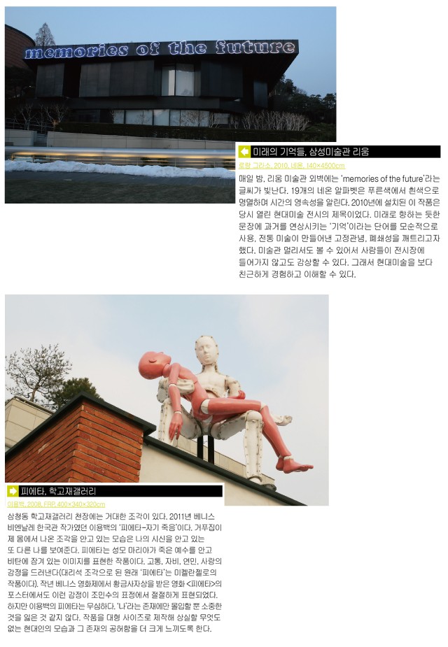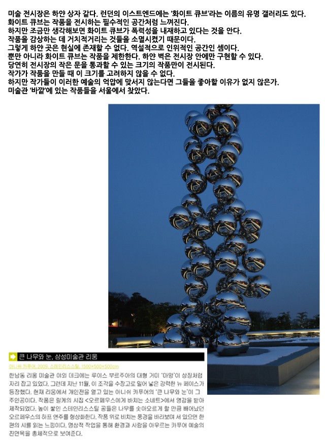 미술관의 하얀 벽은 본질을 생각하게 한다. 예술 작품을 이곳에 전시하는 것이 옳은가? 미술관 밖으로 내보내는 게 더 예술적이진 않은가? 그래서 `바깥`에 있는 작품을 찾고 `공간`과의 관계를 생각했다.