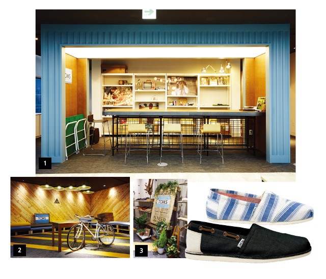 1 실질적인 사무 공간과 바(Bar). 밥도 먹고 수다도 떨고 음악도 듣는다. 시즌별 콘셉트에 맞는 소품들과 소비자들이 직접 디자인한 탐스 슈즈들이 어우러져 있다.
