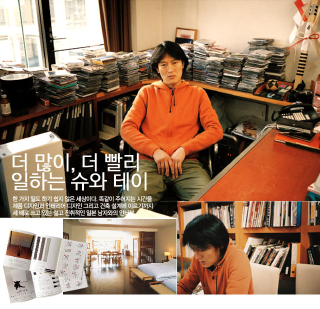 다소 날카로운 눈매의 슈와 테이는 멋쩍은 웃음으로 인터뷰팀을 맞았다. 넓은 탁자를 사이에 두고 앉은 그는 시종일관 짧게 그리고 진지하게 답했다. 세련된 인테리어를 하는 사람들의 사무실 치곤 복잡하고 좁다. “곧 이사를 할 계획이에요. 바로 이 옆에 새 건물을 짓고 있습니다.” 일본의 젊은 디자인을 이끌어 가고 있는 그는 일렉트로니카 뮤지션으로 우리에게 잘 알려져 있는 ‘토와 테이’의 동생이기도 하다. 그를 사람들에게 가장 많이 알린 것은, 쓰임을 쉽게 알 수 없는 독특한 가전제품을 디자인하면서부터다. 아마다나(Amadana)라는 가전제품들은 단순하고 명쾌하지만 직설적이지 않은 디자인으로 라이프 스타일에 관심이 많은 일본 젊은 층으로부터 각광을 받았다. 최근에는 일본의 문방구 메이커 7개 회사를 모아서 새로운 콘셉트의 문구 ‘크래프트 디자인 테크놀로지(Craft Design Technology)’를 생산해서 주목받고 있다. 제품 디자인은 제품 디자이너가 한다는 고정관념을 깨고, 자신이 만드는 공간 안에 모든 것을 자신이 디자인한 제품으로 채우겠다는 이상을 실현시켜 나가고 있는 셈이다. 망원경을 처음 만드는 사람을 위한 톰슨의 법칙(Thopson’s rule for fitst-time telescope makers)이란 게 있다. ‘4인치 반사경을 만든 다음에 6인치 반사경을 만드는 것이, 6인치 반사경 하나 만드는 것보다 더 빠르다.’ 4인치 반사경을 만들고 또 6인치 반사경을 만드는 것은 분명히 6인치 반사경 하나를 만드는 것보다 손이 더 많이 간다. 돌아가는 길이다. 4인치 반사경이 필요한 것도 아니다. 그럼에도 결과적으로 더 많이 하는 것이 더 빠르다는 것이다. 이는, 좀 더 쉬운 일을 하면서 기술과 경험이 생기기 때문이다. 작은 문구에서부터 가전제품, 그리고 인테리어 디자인과 건축에 이르기까지 그 범위를 점점 키워 나가는 그는 본능적으로 톰슨의 법칙을 체득한 사람 같다. 건축가들이 디자인한 가구는 많이 봤지만, 제품 디자인을 하는 것은 생소하다. 가전제품 디자인은 어떻게 시작됐는가, 또 아마다나라는 브랜드가 나오게 된 과정이 궁금하다. 나는 인텐셔날리즈 외에 리얼플리트(Realfleet, www.realfleet.co.jp)라는 회사도 운영 중이다. 도시바 출신 두 사람과 운영하는 회사다. 맨 처음, 가전제품 디자인을 시작할 때는 도시바와 일했다. 당시, 도시바의 쿠마모토라는 사람으로부터 자신의 회사를 설득해달라는 부탁을 받았다. 젊은 층을 위한 상품 개발을 기획 중인데 자신은 젊은 디자이너나 크리에이터가 만들어야 한다는 생각을 갖고 있고, 그 개발을 우리에게 맡길 테니 회사를 설득하는 데 힘을 실어달라는 것이었다. 하지만 회사는 디자인이 기발하다거나 신기하다는 이유만으로는 절대로 상품화할 수 없다는 입장이어서 가전제품 숍이 아닌 라이프 스타일 숍에서만 파는 가전제품을 구상했고 그걸 비즈니스 모델로 제시했다. 그렇게 해서 만들어진 것이 ‘아테하카’라는 브랜드다. 지금은 3백여 개 상점이 파트너 숍이 됐다. 콘셉트 얘기를 해보자면, 먼저 플라스틱을 찍어내기 위해서는 형태를 찍어내는 틀이 필요한데 그 틀을 하나 만들기 위해서도 몇 억엔이라는 금액이 들어간다. 그래서 그 비용을 아끼기 위해 일부만 바꾸어서 전체적인 변화를 꾀하면서, 일본과 서양이 믹스된 생활 스타일에도 대응할 수 있는 식기 같은 느낌의 가전을 만들었다. 이러한 새로운 가전제품이 당시 일본에서는 굉장히 화제가 됐다. 이 후, 쿠마모토와 또 한 명의 파트너인 타베이씨와 함께 리얼플리트라는, 도시바와 관계가 없는 회사를 설립하고 따로 브랜드를 만들어내고 있다. 물론, 그 이후에도 페이스(Face)라는 TV 같은 제품은 도시바의 이름으로 만들기도 했다. 아마다나 제품들은 겉모양만으로는 무엇인지 알 수가 없었다. 용도를 알 수 없는 디자인이란 생소한 느낌이었다. 아마다나 제품 디자인의 핵심은 무엇인가. 가구로서의 가전 같은 느낌이 아마다나의 핵심이다. 한국의 네티즌 사이에서 아마다나의 사용 설명서 그림이 화제였다. 용도를 알 수 없다는 것과 유머러스하다는 점에서 제품 디자인과 일맥상통하는 느낌이다. 사용자들로부터 우리가 만든 가전제품 디자인이 꽤 남성적이어서 가까이하기 어렵다는 얘기를 들었다. 그렇다면 유저인터페이스(User Interface)로서 유머가 있는 뭔가를 해볼까 생각하던 중 전자레인지에 젖은 고양이를 넣고 돌렸더니 고양이가 죽자, 가전제품 회사에 소송을 걸었다는 미국에서의 일화가 떠올랐다. 상식적으로는 일어나지 않을 법한 일을 하는 사람들이 있고 제품의 주의사항에 표시하기도 한다. ‘고양이를 넣지 말라’고 씌어 있는 경우는 없었지만. 그래서 그런 것을 한눈에 알 수 있는 인터페이스로 하되 유머러스하게 만든 것이다. 제품 디자인에 있어서 기능과 디자인 중 어떤 점을 우선시하는가. 양쪽 다 중요하다. 물론 아름답지 않으면 안 되겠지만, 이 때문에 부피가 너무 커진다든가, 사용감이 나빠서는 안 된다. 건축도 마찬가지다. 처음부터 가격을 정하고 거기에 디자인을 끼워 맞추는 방식은 리얼플리트에서는 지양한다. 우리는 나무 손잡이를 넣거나 가죽을 붙이기도 한다.